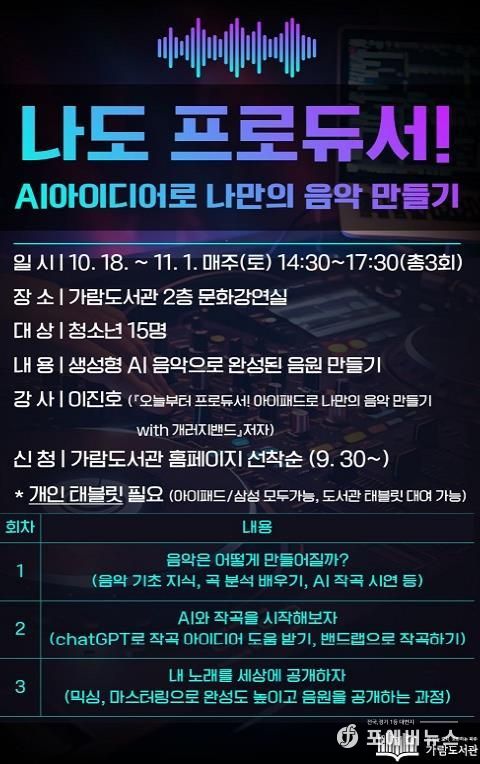 [ 포에버뉴스 김경순 기자 ] 파주시 가람도서관은 오는 10월, 청소년을 위한 창의적 음악 프로그램 ‘나도 프로듀서! 인공지능(AI) 아이디어로 나만의 음악 만들기’를 운영한다고 밝혔다.