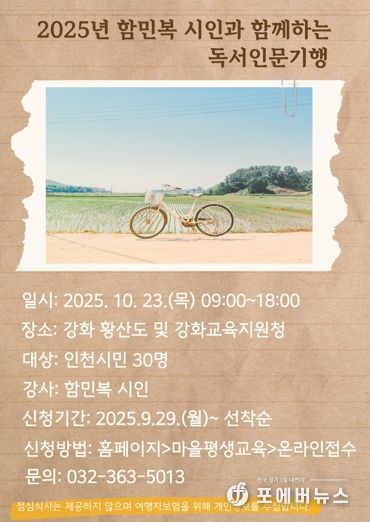[ 포에버뉴스 김경순 기자 ] 인천광역시교육청신트리도서관은 10월 23일 인천시민을 대상으로 ‘함민복 시인과 함께하는 독서인문기행’을 운영한다.