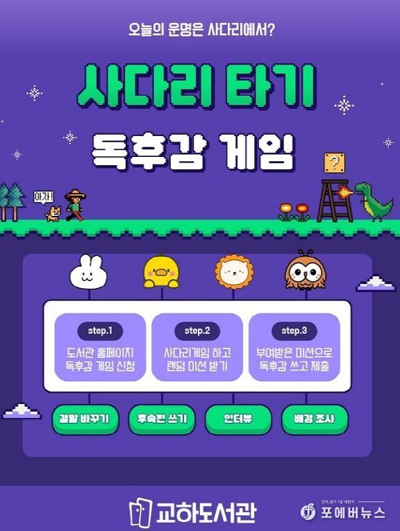 [ 포에버뉴스 김경순 기자 ] 파주시 교하도서관은 오는 10월 2일부터 11월 30일까지, 게임형 독후감 미션을 접목한 독서진흥 프로그램 ‘독후감 게임’을 운영한다.