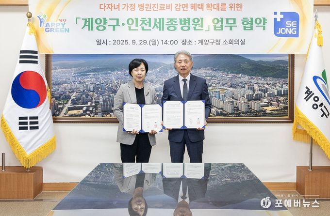 [ 포에버뉴스 김경순 기자 ] 인천광역시 계양구는 9월 29일 인천세종병원(병원장 오병희)과 ‘다자녀 가정 병원진료비 감면 확대’를 위한 업무협약을 체결했다.