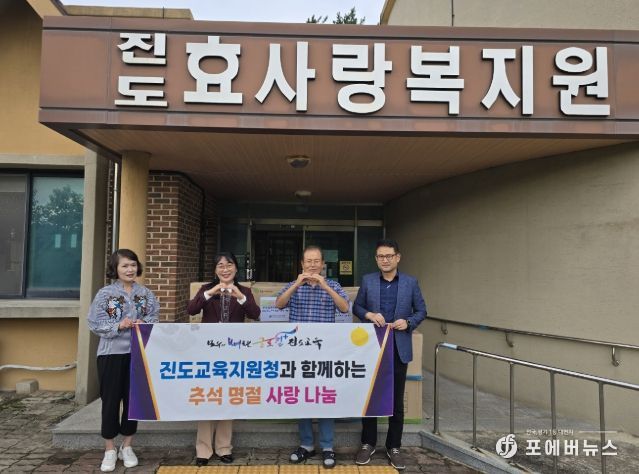 [ 포에버뉴스 오명숙 기자 ] 진도교육지원청은 9월 29일 다가오는 추석 명절을 맞아 지역 내 사회복지시설 2곳(효사랑복지원, 카리타스노인복지센터)을 방문해 정성을 담아 준비한 위문품을 전달하며 따뜻한 이웃사랑을 실천했다.