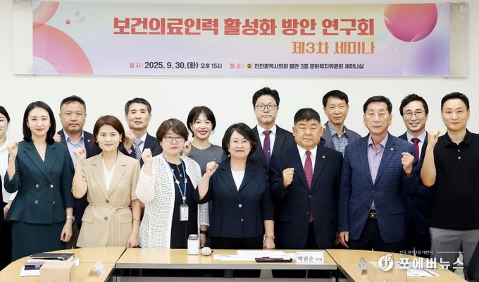 [ 포에버뉴스 김경순 기자 ] 인천광역시의회 의원연구단체인 ‘보건의료인력 활성화 방안 연구회’는 30일 문화복지위원회 세미나실에서 박판순 대표의원(국·비례)을 비롯해 박창호(국·비례)·이봉락(국·미추홀구3) 의원, ‘의료기사단체 정책연구단’관계자 등이 참석한 가운데 ‘제3차 정책 세미나’를 개최했다.