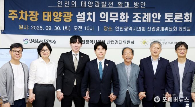 인천시의회 산업경제위원회는 30일 세미나실에서 ‘인천의 태양광 발전 확대 방안, 주차장 태양광 설치 의무화 조례안 토론회’를 개최했다.