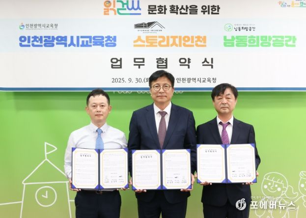 [ 포에버뉴스 김경순 기자 ] 인천광역시교육청은 9월 30일 ㈜월미하이랜드(대표 이덕성) 스토리지인천, 남동희망공간(대표 유병희)과 함께 ‘읽걷쓰’ 문화 확산을 위한 업무협약을 체결했다.