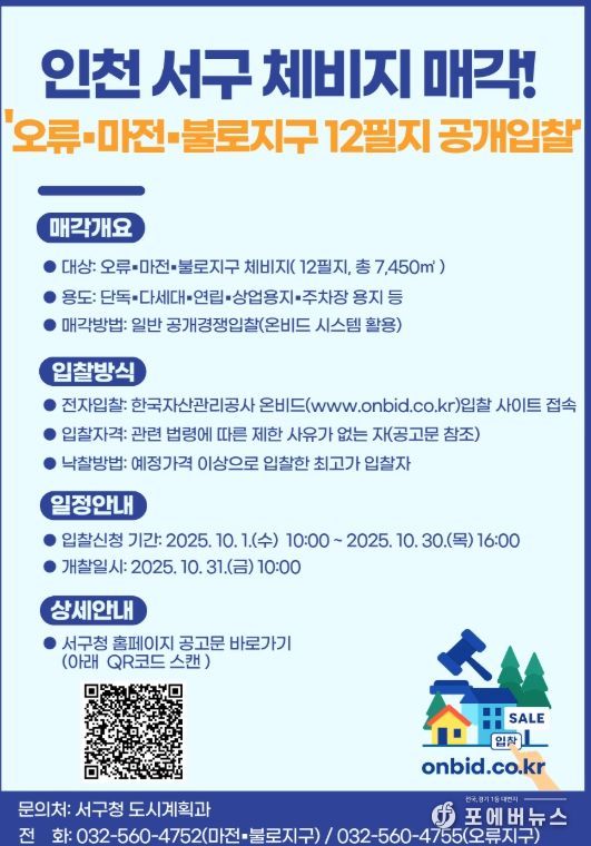 [ 포에버뉴스 김경순 기자 ] 인천 서구는 오는 10월 1일부터 30일까지 오류, 마전, 불로지구 토지구획정리사업구역 내 체비지 12필지를 일반 공개경쟁 입찰(전자입찰) 방식으로 매각한다고 밝혔다.