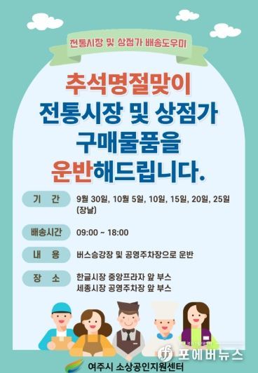 [ 포에버뉴스 박정배 기자 ] 여주시는 여주시소상공인지원센터 주관으로 다가오는 추석 명절을 맞이하여 전통시장과 상점가를 찾는 시민들의 편의를 돕고 전통시장 활성화를 위해 ‘전통시장 및 상점가 배송 도우미’ 서비스를 운영한다.