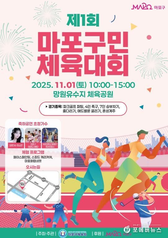 마포구체육회가 주최, 주관하고 마포구가 후원하는 ‘마포구민 체육대회’는 11월 1일 망원유수지 체육공원에서 열린다.