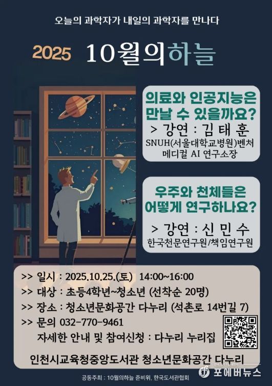 [ 포에버뉴스 김경순 기자 ] 인천광역시교육청중앙도서관 청소년문화공간 다누리는 10월 25일 토요일 오후 2시 청소년을 대상으로 과학자들의 재능기부 강연 프로그램 ‘10월의 하늘’을 개최한다.