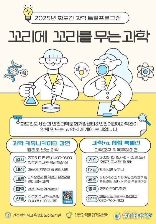 [ 포에버뉴스 김경순 기자 ] 인천광역시교육청화도진도서관은 지역사회의 과학문화 확산을 도모하기 위하여 오는 10월 16일부터 31일까지 인천시민 대상‘꼬리에 꼬리를 무는 과학’을 운영한다.