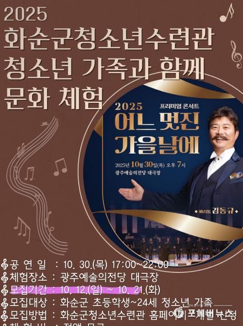 [ 포에버뉴스 오명숙 기자 ] 화순군은 2일 청소년수련관에서 짙어가는 가을의 정취 속에 청소년과 가족이 함께하는 특별한 문화체험, 바리톤 김동규의 프리미엄 콘서트'어느 멋진 가을날'을 관람할 청소년 가족 60명을 선착순 모집한다고 밝혔다.