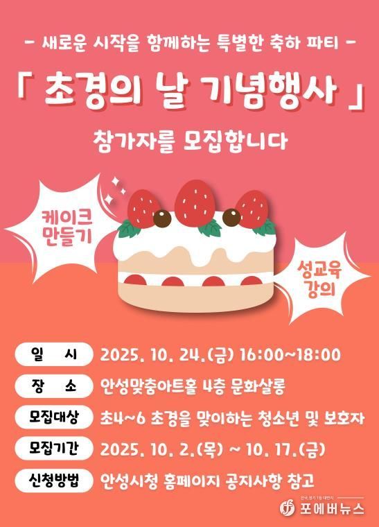 안성시 관계자는 “다가오는 행사가 또래 친구들과 함께 초경을 축하하고 경험을 나누는 소통과 공감의 장이 되길 바란다”며, “이를 통해 초경에 대한 긍정적 인식이 확산되는 계기가 되기를 기대한다”고 전했다.