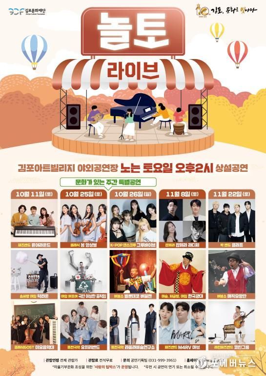 [ 포에버뉴스 김경순 기자 ] (재)김포문화재단은 10월 11일부터 11월 22일까지 매월 둘째, 넷째 주 토요일마다 김포아트빌리지 야외공연장에서 하반기 토요상설공연 '놀토 라이브'를 개최한다고 밝혔다.