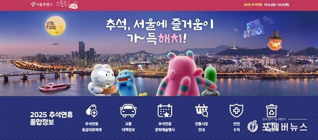 [ 포에버뉴스 김경순 기자 ] 서울시가 7일간의 추석 연휴 기간 동안 시민들이 안전하고 쾌적하게 지낼 수 있도록 다양한 정보를 한곳에 모은 ‘2025 추석연휴 종합정보’서비스를 서울시 대표 누리집을 통해 제공한다.