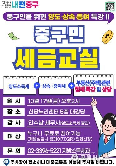 [ 포에버뉴스 김경순 기자 ] 서울 중구가 어렵게만 느껴지는 세금에 대한 이해를 돕기 위해 오는 17일 오후 2시 신당누리센터 5층 대강당에서 '중구민 세금교실' 특강을 연다.