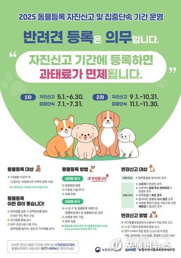 [ 포에버뉴스 김경순 기자 ] 양천구는 반려동물의 유실·유기 방지와 체계적인 관리 강화를 위해 오는 10월 31일까지 ‘동물등록 자진신고 기간’을 운영한다고 9일 밝혔다.