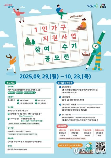 [ 포에버뉴스 김경순 기자 ] 서울시가 1인가구 지원사업의 성과를 공유하고 참여자들의 생생한 목소리를 담아내기 위해 '2025년 1인가구 지원사업 참여 수기 공모전'을 개최한다.