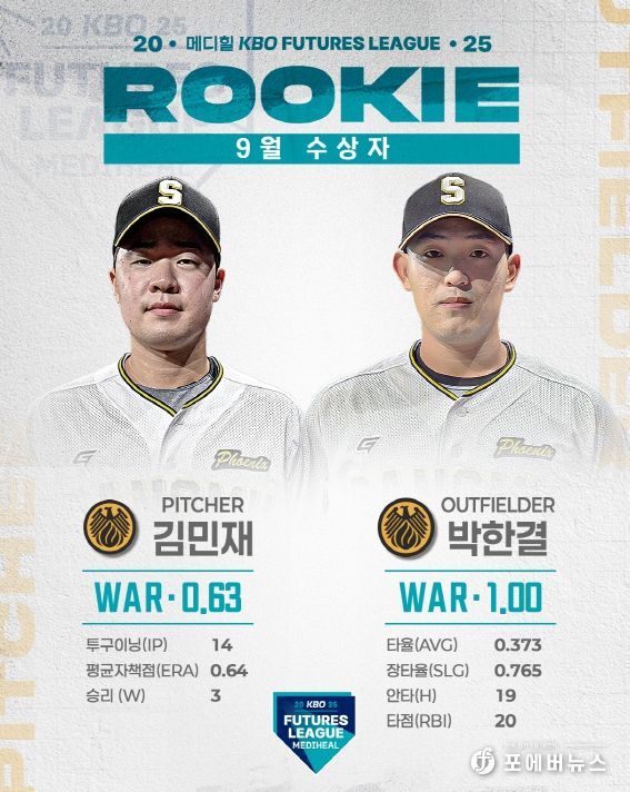 [ 포에버뉴스 사공선 기자 ] 2025 메디힐 KBO 퓨처스리그의 9월 퓨처스 루키상 수상자로 투수 부문에는 상무 김민재가 WAR 0.63, 타자 부문에는 상무 박한결이 WAR 1.00을 기록하며 각각 선정됐다.