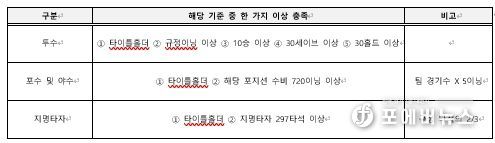 KBO 정규시즌 개인 부문별 1위 선수는 자격요건에 관계없이 기준이 충족된 포지션의 후보로 자동 등록된다. 단, 타이틀홀더에 한해 여러 포지션 출전으로 어느 포지션에서도 수비이닝 기준을 충족하지 못했을 경우, 최다 수비이닝을 소화한 포지션의 후보가 된다. 수비이닝과 지명타자 타석을 비교해야 할 경우에는 각 해당 기준 대비 비율이 높은 포지션의 후보로 등록된다.