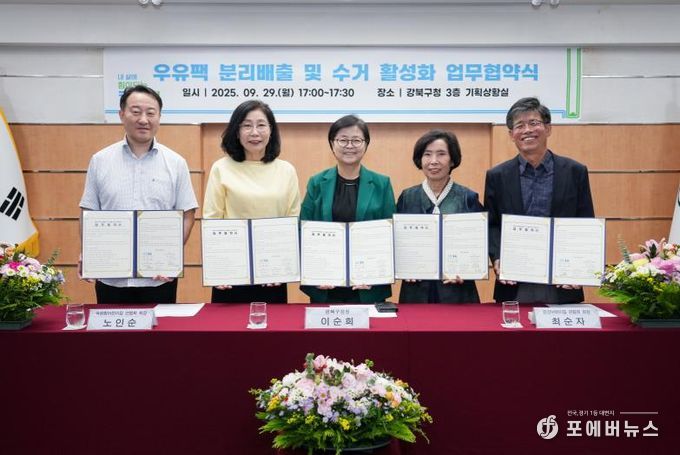 [ 포에버뉴스 김경순 기자 ] 서울 강북구는 9월 29일(월) 구청 기획상황실에서 강북구어린이집연합회와 어진이마을관리 사회적협동조합과 함께 우유팩 분리배출 및 수거 활성화 기반 구축을 위한 업무협약을 체결했다고 밝혔다.