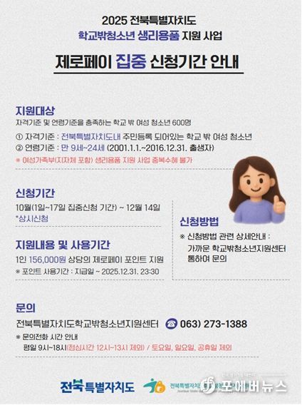 [ 포에버뉴스 이승훈 기자 ] 전북특별자치도가 경제적 부담을 겪는 학교 밖 여성청소년들을 대상으로 생리용품을 지원하는‘2025년 학교 밖 여성청소년 건강지원사업’을 추진한다.
