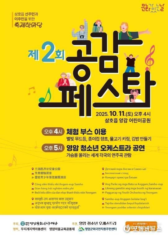 [ 포에버뉴스 오명숙 기자 ] (재)영암문화관광재단과 영암청소년오케스트라는 문화가 있는날 행사지원 사업으로 2025년 10월 11일 오후 4시 삼호읍 앙감 어린이 공원에서 ‘제2회 공감페스타’행사를 개최한다.