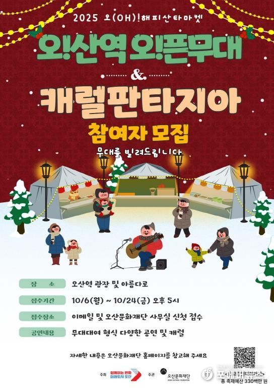 오산문화재단 신선교 대표이사는 “이번 ‘오!산역 오!픈무대’와 ‘캐럴 판타지아’는 단순한 부대행사가 아니라 시민과 지역 예술인이 함께 어우러지는 참여형 문화 프로그램”이라며 “예술과 축제가 어우러지는 이번 겨울, 많은 시민의 참여를 기대한다”고 전했다.