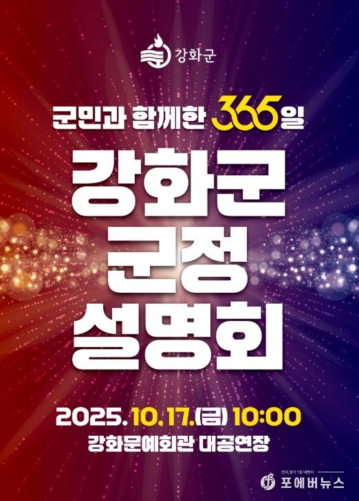 [ 포에버뉴스 김경순 기자 ] 강화군은 오는 10월 17일 오전 10시 강화문예회관에서 “군민과 함께한 365일, 강화군 군정 설명회”를 개최한다.