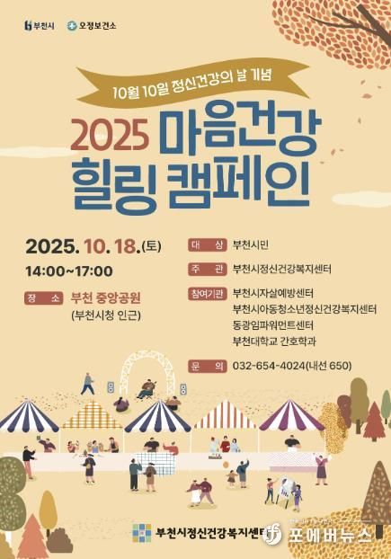 [ 포에버뉴스 김경순 기자 ] 부천시는 부천시정신건강복지센터와 함께 2025년 정신건강의 날(10월 10일)을 기념해 10월 18일 오후 2시부터 부천중앙공원에서 ‘2025 마음건강 힐링캠페인’을 연다.