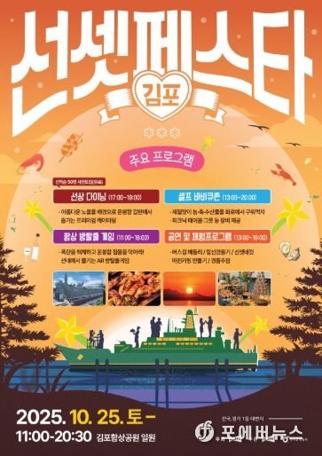 [ 포에버뉴스 김경순 기자 ] 아름다운 석양을 배경으로 선상 다이닝을 즐길 수 있는 특별한 축제가 김포에서 열린다. 오는 25일 단 하루, 토요일 오전 11시부터 밤 8시 30분까지 대곶면 김포함상공원 일원에서 ‘2025 김포 선셋 페스타 위드(with) 로컬푸드 다이닝’이 개최된다.