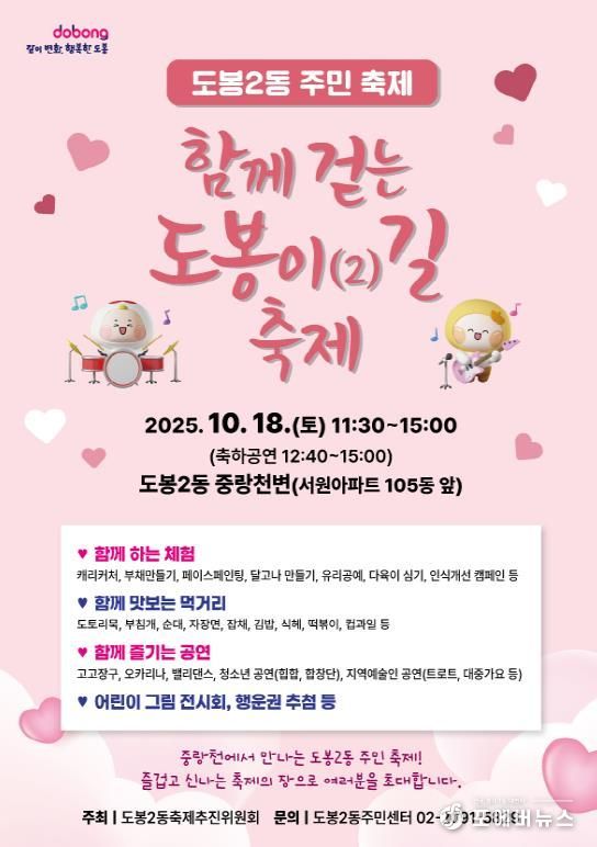 [ 포에버뉴스 김경순 기자 ] 서울 도봉구가 10월 18일 오전 11시 30분 중랑천변(서원아파트 105동 앞) 일대에서 ‘함께 걷는 도봉이(2)길’ 축제를 개최한다.
