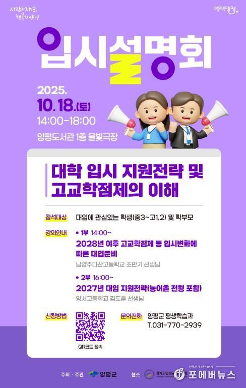 [ 포에버뉴스 박정배 기자 ] 양평군은 오는 10월 18일 오후 2시, 양평도서관 물빛극장에서 관내 학생과 학부모를 대상으로 ‘2025년 양평군 대학 입시설명회’를 개최한다고 밝혔다. 이번 설명회는 대학 입시에 관심 있는 학생과 학부모에게 다양한 입시 정보를 제공하기 위해 마련됐다.