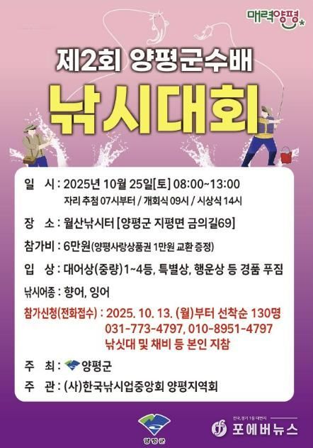[ 포에버뉴스 박정배 기자 ] 양평군은 오는 25일 관내 월산낚시터에서 ‘제2회 양평군수배 낚시 대회’를 개최한다고 밝혔다.