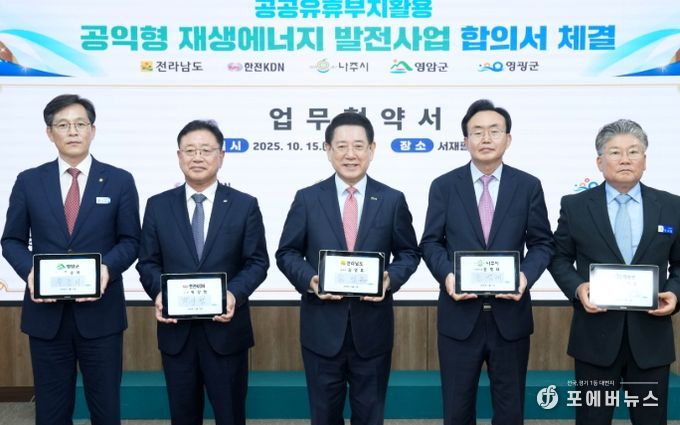 [ 포에버뉴스 사공선 기자 ] 전라남도는 15일 새정부의 재생에너지 대전환 기조와 재생에너지 보급 확대 정책에 따라 나주시, 영광군, 영암군, 한전KDN과 탄소중립 실현·에너지 기본소득 실현을 위한 ‘공익형 재생에너지 발전사업’ 업무협약을 했다고 밝혔다.