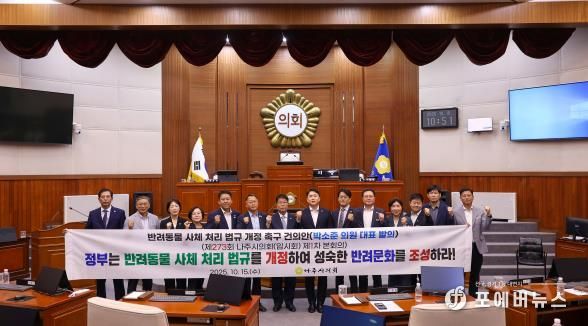 [ 포에버뉴스 오명숙 기자 ] 나주시의회는 15일 제273회 임시회 제1차 본회의를 열고 ‘반려동물 사체 처리 법규 개정 촉구 건의안’을 채택했다.