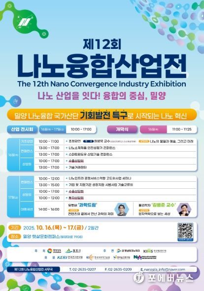 [ 포에버뉴스 사공선 기자 ] 경상남도는 오는 16일부터 17일까지 이틀간 밀양햇살문화캠퍼스에서 ‘나노산업을 잇다! 융합의 중심, 밀양’을 주제로 제12회 나노융합산업전(나노피아 2025)을 개최한다고 밝혔다.