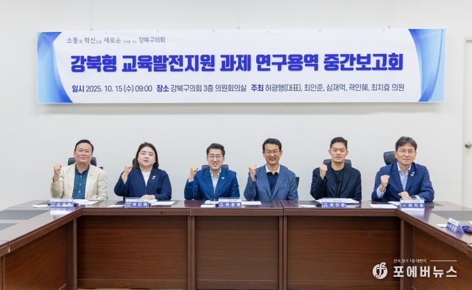 [ 포에버뉴스 김경순 기자 ] 강북구의회 의원연구단체인 ‘강북형 교육발전지원 연구회’ (대표의원 허광행)는 지난 10월 15일 의회 3층 의원회의실에서 중간보고회를 열었다.