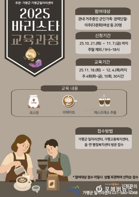 [ 포에버뉴스 김경순 기자 ] 가평군은 군인가족, 경력단절여성, 다문화여성 등 취업취약계층 여성을 대상으로 ‘바리스타 2급 자격증 취득과정’을 운영하며, 총 20명의 교육생을 모집한다.