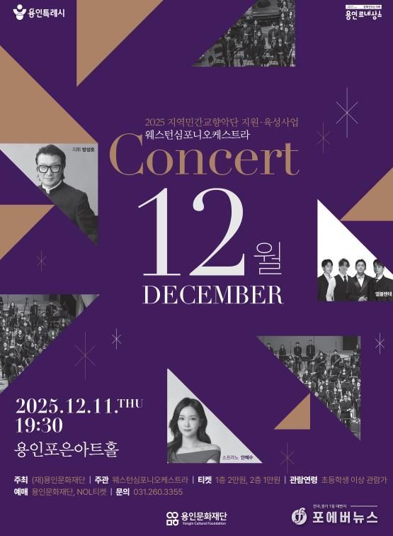 [ 포에버뉴스 김경순 기자 ] 용인문화재단은 오는 12월 11일 오후 7시 30분, 용인포은아트홀에서 웨스턴심포니오케스트라 '콘서트 ‘12월’' 공연을 개최한다.
