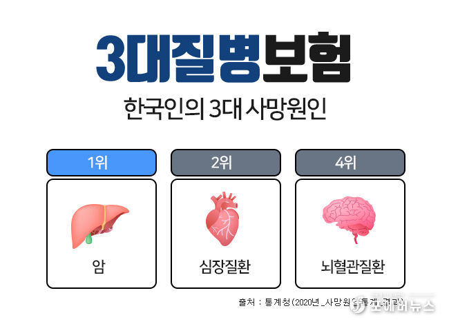 [ 포에버뉴스 김경순 기자 ] 흔히 3대질병이라 일컫는 암, 심혈관질환, 뇌혈관질환은 통계청 발표자료에 따르면 한국인의 주요 사망원인 중에서 3위 폐렴을 제외하고 1~4위를 차지하고 있으며, 이전부터 지금까지도 살면서 가장 먼저 대비해야 하는 치명적인 질병으로 강조되고 있다. 이러한 중대질병에 대비하기 위하여 상기 세가지 치명적인 질병을 집중보장하는 3대질병진단비보험을 많이 가입하고 있다. 3대진단비보험은 각각의 질병을 중점적으로 보장하면서도 가입자 특성에 맞는 특약을 추가함으로써 종합건강보험으로도 활용할 수가 있다.