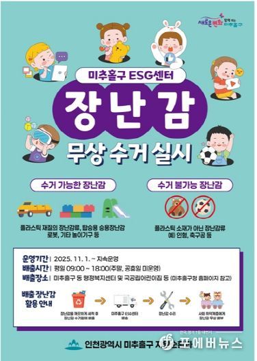 [ 포에버뉴스 김경순 기자 ] 인천 미추홀구시설관리공단(이사장 박종구)은 구(區) 자원순환과가 주관하는 ‘장난감 무상 수거 및 수리 사업’에 동참한다고 3일 밝혔다.