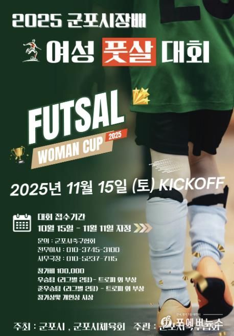 [ 포에버뉴스 김경순 기자 ] 군포시는 여성 생활체육 참여 확대와 건전한 스포츠 문화 확산을 위해 ‘2025 군포시장배 여성 풋살대회’를 오는 11월 15일(토) 군포시 국민체육센터 축구장에서 개최한다.