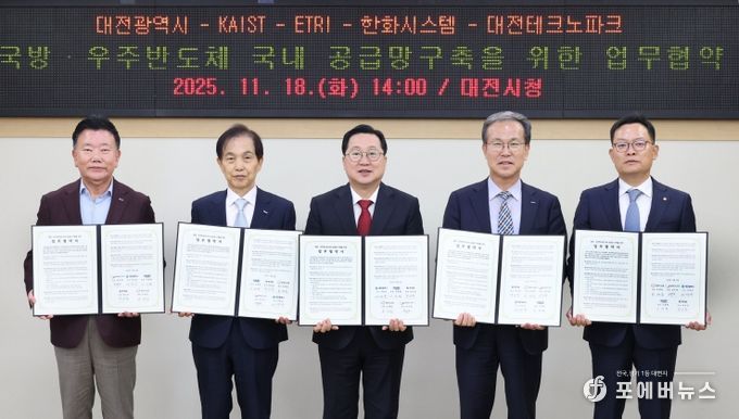 [ 포에버뉴스 사공선 기자 ] 대전시는 18일 시청에서 KAIST, 한국전자통신연구원(ETRI), 한화시스템, 대전테크노파크와 ‘국방·우주반도체 국내 공급망 구축을 위한 업무협약’을 체결했다.