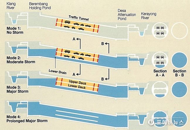 ‘SMART’는 총 4단계로 운영되는데 1단계에는 정상 운행하다가 2단계로 상향되면 도로는 정상 운영하되 하부 빗물 터널에만 물을 담기 시작한다. 3단계에 접어들면 차량 통행을 통제, 4단계가 되면 도로와 빗물 터널 전체를 수로로 활용한다.