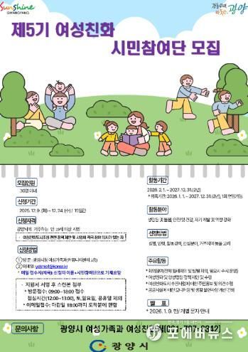 시 관계자는 “여성친화 시민참여단은 시민의 경험과 시각이 정책으로 이어지는 중요한 통로”라며 “광양시는 그동안 시민참여단 운영을 통해 생활밀착형 정책 제안과 현장 중심 모니터링을 지속해 왔다. 일상에서 느낀 불편과 아이디어를 정책에 반영하고자 하는 시민들의 적극적인 참여를 기대한다”고 말했다.