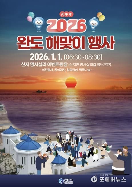 [ 포에버뉴스 오명숙 기자 ] 완도군은 내년 1월 1일 오전 6시 30분부터 8시 30분까지 신지 명사십리 이벤트 광장에서 ‘병오년(丙午年) 해맞이 행사’를 개최한다.