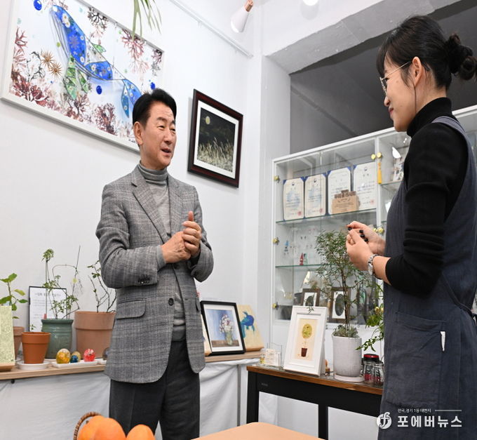 이번 방문은 의정부다움을 담은 시민의 이야기에 귀를 기울이는 ‘민생속으로’ 프로그램의 일환으로 마련했다. 김동근 시장은 작가와 함께 압화 작품을 살펴보며 기록성과 지역성, 예술성이 어우러진 공예의 의미를 나누고, 현장의 목소리를 시정에 반영하는 소통 행정의 방향을 다시 한번 확인했다.