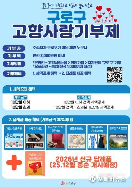 장인홍 구로구청장은 “고향사랑기부제는 기부자에게 세액공제와 답례품이라는 풍성한 혜택까지 함께 누릴 수 있는 제도”라며 “지역 경제에 활력을 불어넣고 우리 이웃들에게 따뜻한 희망이 될 수 있도록 많은 관심과 참여를 바란다”고 말했다.
