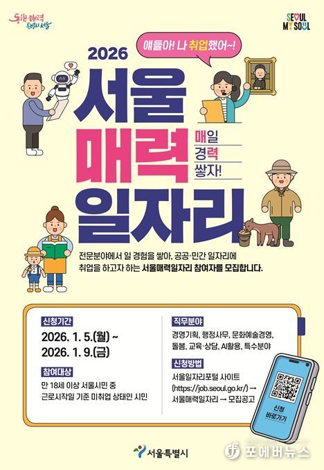 [ 포에버뉴스 사공선 기자 ] 서울시는 직무교육과 실제 일 경험을 통해 민간 취업으로 연계하는 대표 디딤돌 일자리 사업인 ‘서울 매력일자리’를 2026년 총 3,600명 규모로 확대 운영한다.