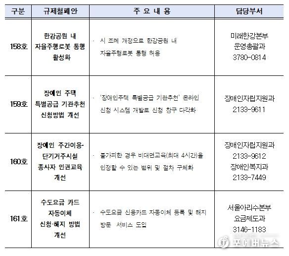 서울시는 내년 상반기 중으로 ▴한강공원 자율주행로봇 통행 허용(158호) ▴장애인주택 특별공급 기관추천 신청방법 개선(159호) ▴장애인시설 종사자 인권교육 개선(160호) ▴수도요금 카드 자동이체 개선(161호), 총 4건의 규제를 개선하겠다고 밝혔다.