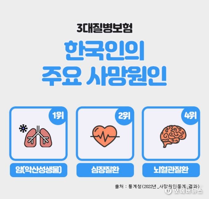 [ 포에버뉴스 김경순 기자 ] 3대질병으로 일컬어지는 암, 뇌혈관질환, 심혈관질환은 한국인의 주요 사망원인에서 상위를 차지하고 있으며, 이에 대한 진단비를 집중적으로 보장해 주는 보험상품을 3대질병진단비 보험이라 할 수 있다.